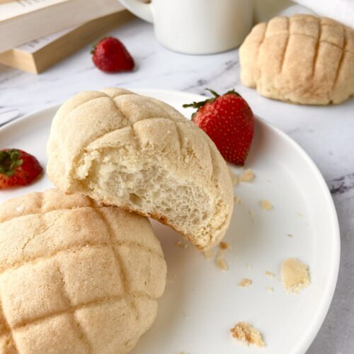 Although it can be! In Japan, I’ve been told they sometimes cut the sweet bread lengthwise and serve and fill it with melon flavored ice cream. (Yum!) But as far as the bread being made with actual melons…it’s not. I’ve heard a theory that it gets its name from the crisscross pattern that’s usually scored into the top of the cookie shell. Which can, in a way, resemble the fleshy part of a melon when cut into crisscross squares.
